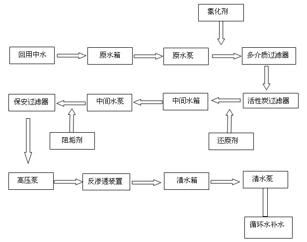 SBetz中水回用于循环冷却水的成套设备的工艺流程: