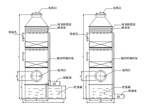 该套系统是有1台立式废气洗涤塔组成,立式废气洗涤塔是气液逆流运行,抽出的废气由塔底气体入口进入塔体,自下而上穿过填料层,最后从塔顶管道出口经防腐蚀风机排出。中和药水通过循环水泵打到塔顶通过液体分布器,均匀地喷淋到填料层中沿着填料层表面向下流动,进入循环药箱。由于上升废气和下降吸收剂在填料层中不断接触,所以上升气流中溶质的浓度越来越低,到塔顶时已达到吸收要求后排出塔外。相反下降液体中的介质浓度越来越高,到塔底时达工艺条件要求,排出塔外。